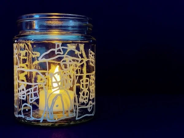 Etwas einfacher aber dennoch sehr schön sind die Windlichert. Jedes Kind bemalte ein Glas woraus ein Windlicht entstand..